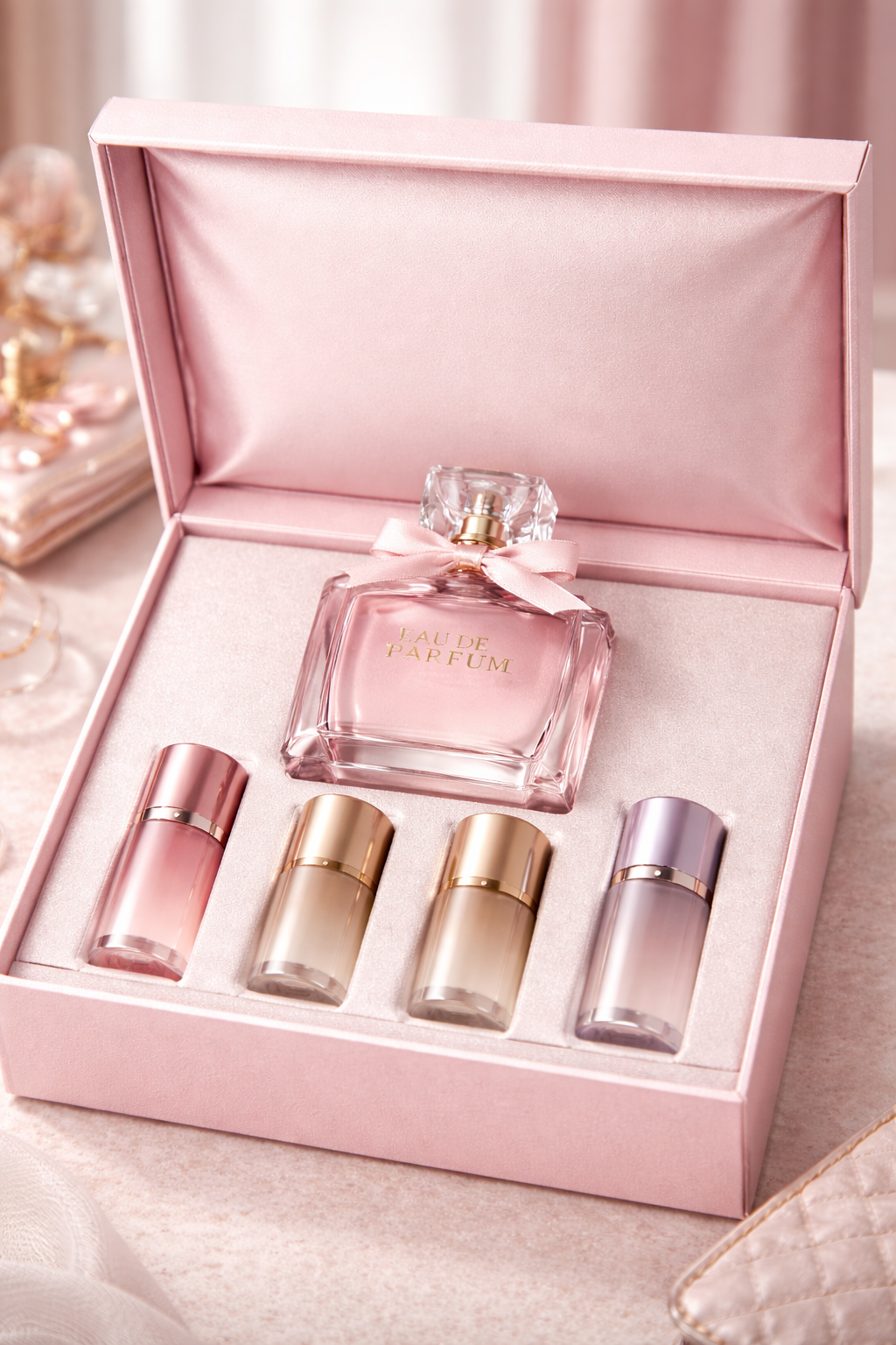Each set includes 1× 100ml main bottle and 4× 5ml mini vials, allowing you to enjoy your favourite scent both at home and on the go.